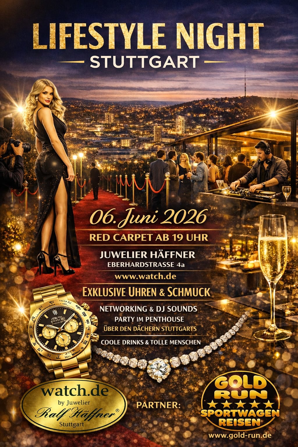 6. Juni 2026 | Lifestyle Night – Juwelier Ralf Häffner | Champagner. Luxusfahrzeuge. Schmuck- und Uhrenhighlights. Ein exklusiver Abend mit DJ, stilvoller Inszenierung und ausgewählter Gästeliste. GOLD RUN trifft Luxus-Lifestyle.