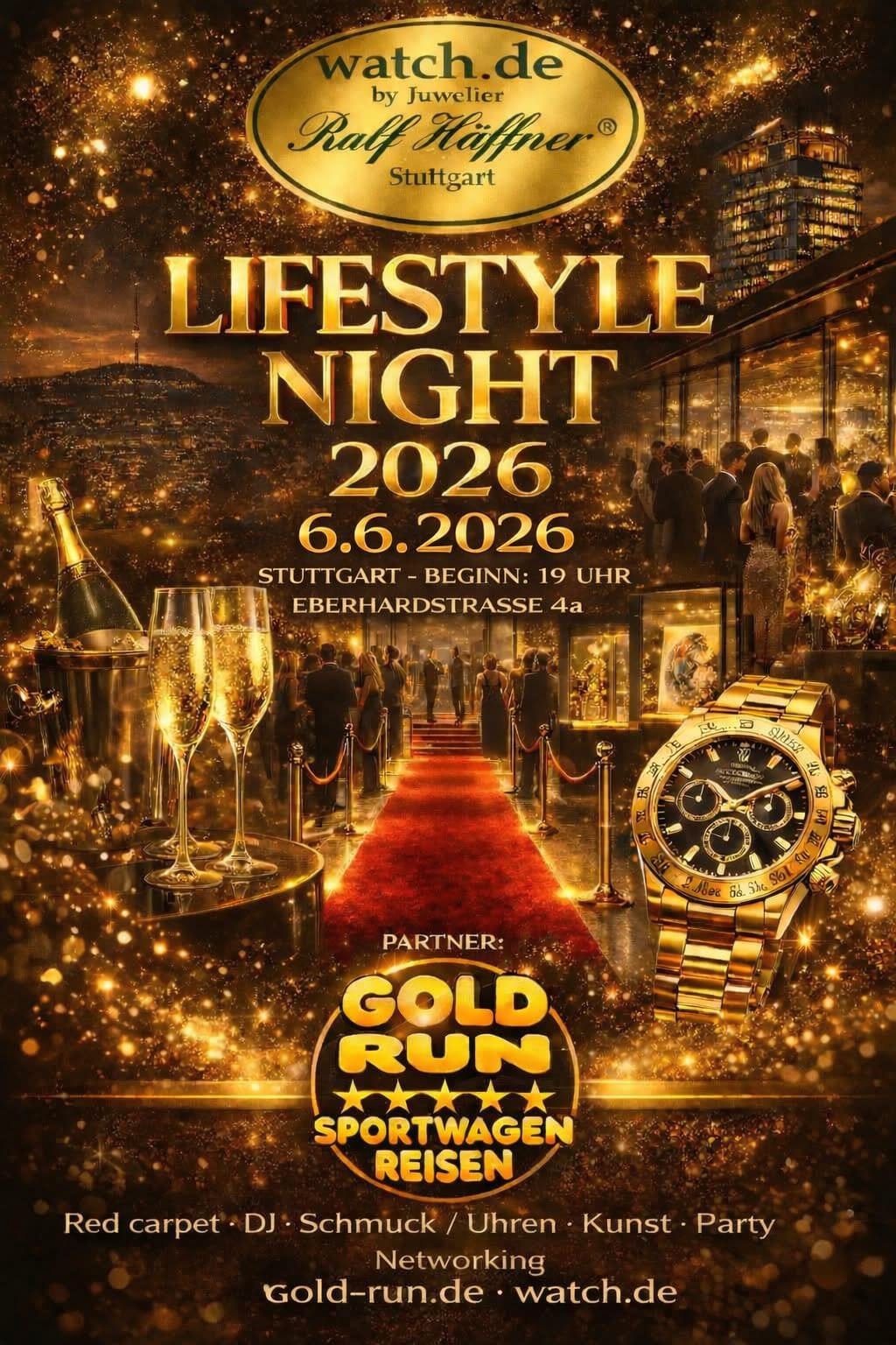 6. Juni 2026 | Lifestyle Night – Juwelier Ralf Häffner | Champagner. Luxusfahrzeuge. Schmuck- und Uhrenhighlights. Ein exklusiver Abend mit DJ, stilvoller Inszenierung und ausgewählter Gästeliste. GOLD RUN trifft Luxus-Lifestyle.